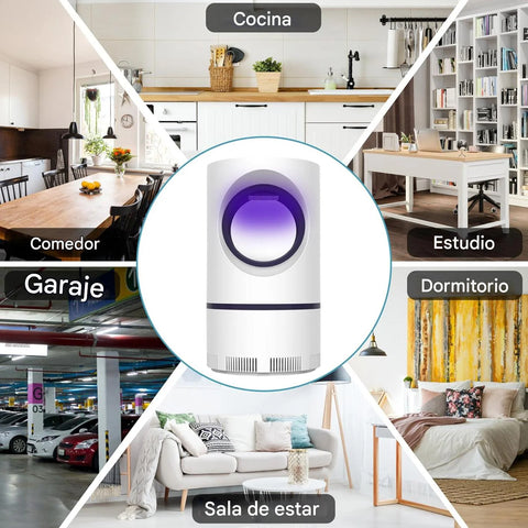 Esta lámpara atrapa y elimina mosquitos, zancudos y otros insectos voladores usando luz UV, sin liberar humo, olores ni productos tóxicos.